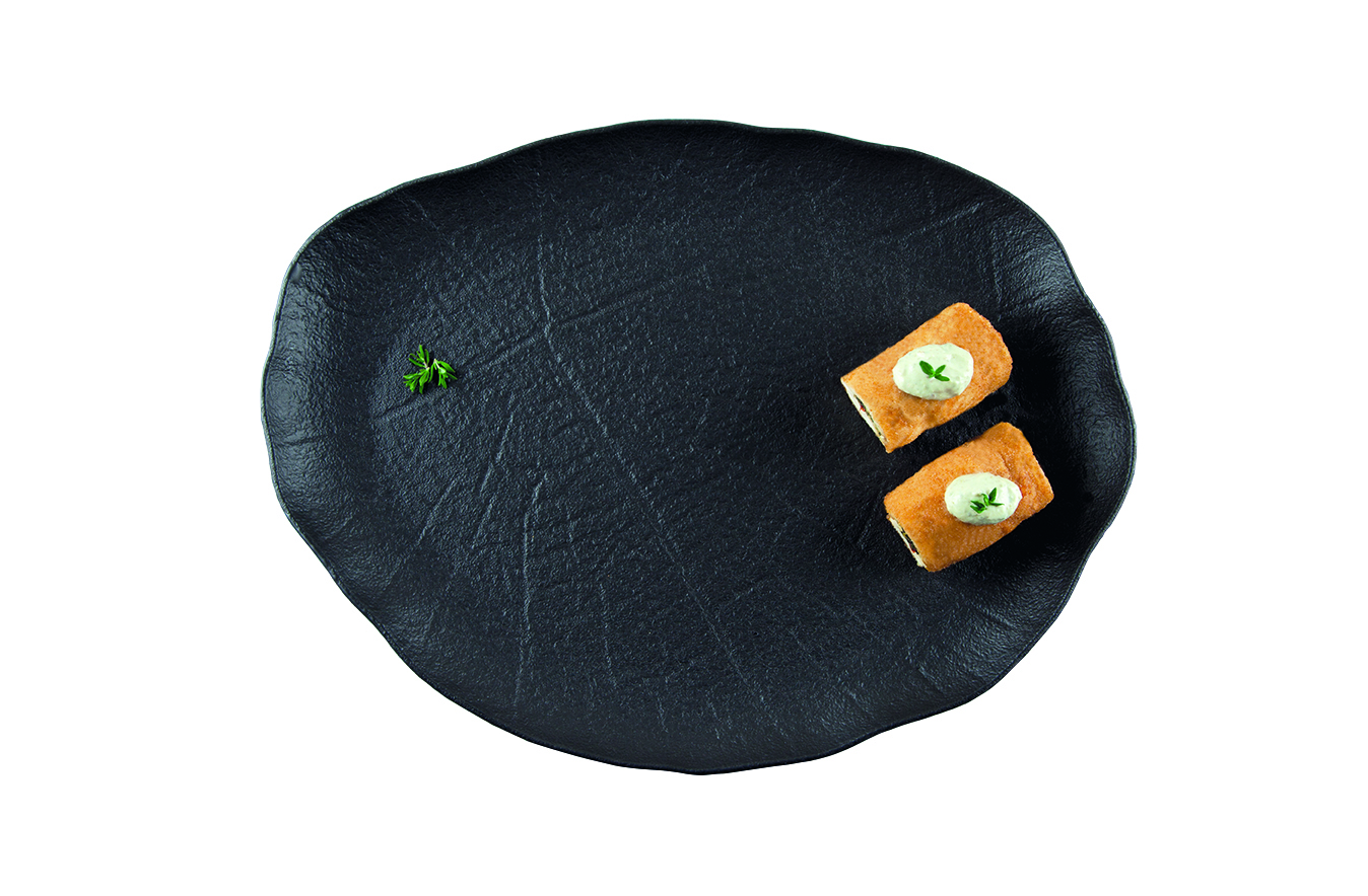 Блюдо для подачи насыщенного черного цвета со стилизацией поверхности под рисунок листьев лотоса.