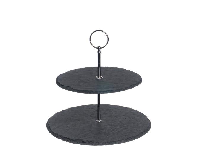 string(560) "Этажерка под закуски, изготовленная из натурального природного материала – сланца. Сочетание естественной фактуры и строгого серого цвета камня смотрится необычайно стильно, она не только послужит отличным украшением праздничного стола, но позволит красиво подать приготовленные закуски или сладости."