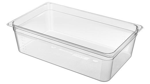 Гастроемкость GN 1/1 65 отвечает всем европейским и российским гигиеническим стандартам и нормам. Их можно мыть в любой посудомоечной машине при температуре до +95°С, используя любое моющее средство. Изготовлена из поликарбоната, цвет прозрачный.