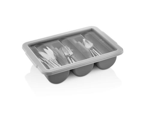 Емкость для столовых приборов (40*29*9,5 см) из полипропилена на 3 секции. Удобные ручки обеспечивают надежный хват. Возможность штабелирования экономит место при хранении. Подходит для мытья в посудомоечной машине.