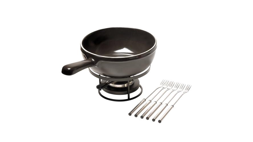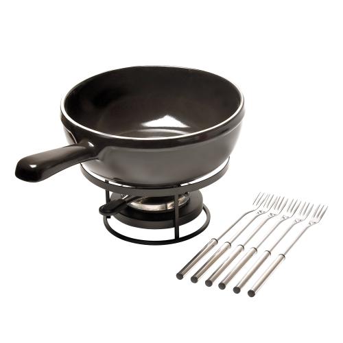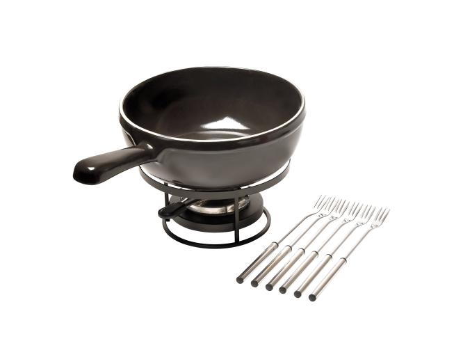 Набор для фондю состоит из кастрюли, подставки, подставки для топлива, 6 вилок. Емкость может быть использована в СВЧ, духовке, на любых типах нагрева (газ, электричество). Но не подходит для индукции. Выдерживает температуры от -20С до +270С. Материал: высококачественная керамика. Можно мыть в посудомоечных машинах.