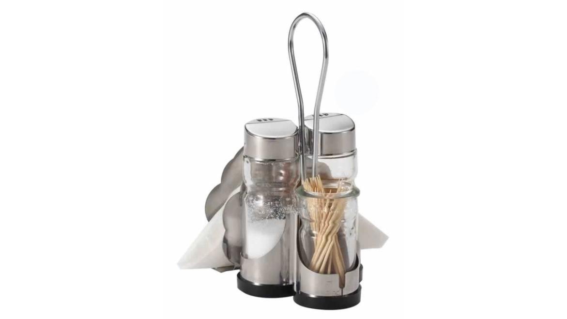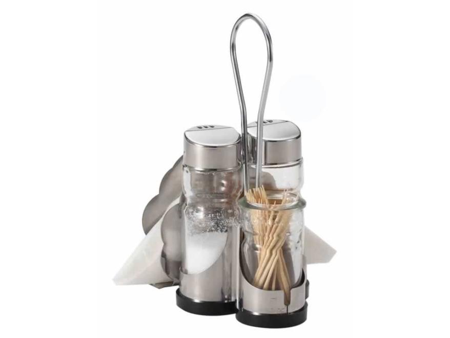 string(262) "Набор предметов для специй с салфетницей, в который входит солонка и перечница + стаканчик для зубочисток.