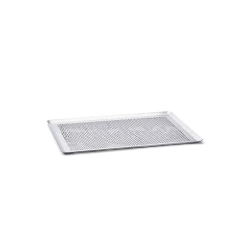 Микроперфорированный прямоугольный противень со скошенными краями, изготовленный из алюминия без покрытия.
