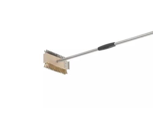 Двухсторонняя щетка для чистки гриля со скребком и металлической щетиной из латуни и железа. Щетка снабжена трубчатой ручкой круглого сечения из нержавеющей стали. Торцевая рукоятка и промежуточная (скользящая) втулка изготовлены из ударопрочного теплозащитного полимера. Стальная щетина обеспечивает устранение самой сложной грязи, а щетина из латуни идеально подходит для очистки решеток гриля от остаточного загрязнения.