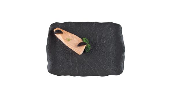 Блюдо для подачи насыщенного черного цвета со стилизацией поверхности под рисунок листьев лотоса.