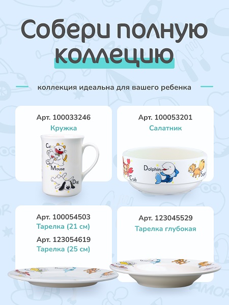 Коллекция "KIDS" выполнена из профессионального твердого фарфора теплого сливочного оттенка с детским декором.