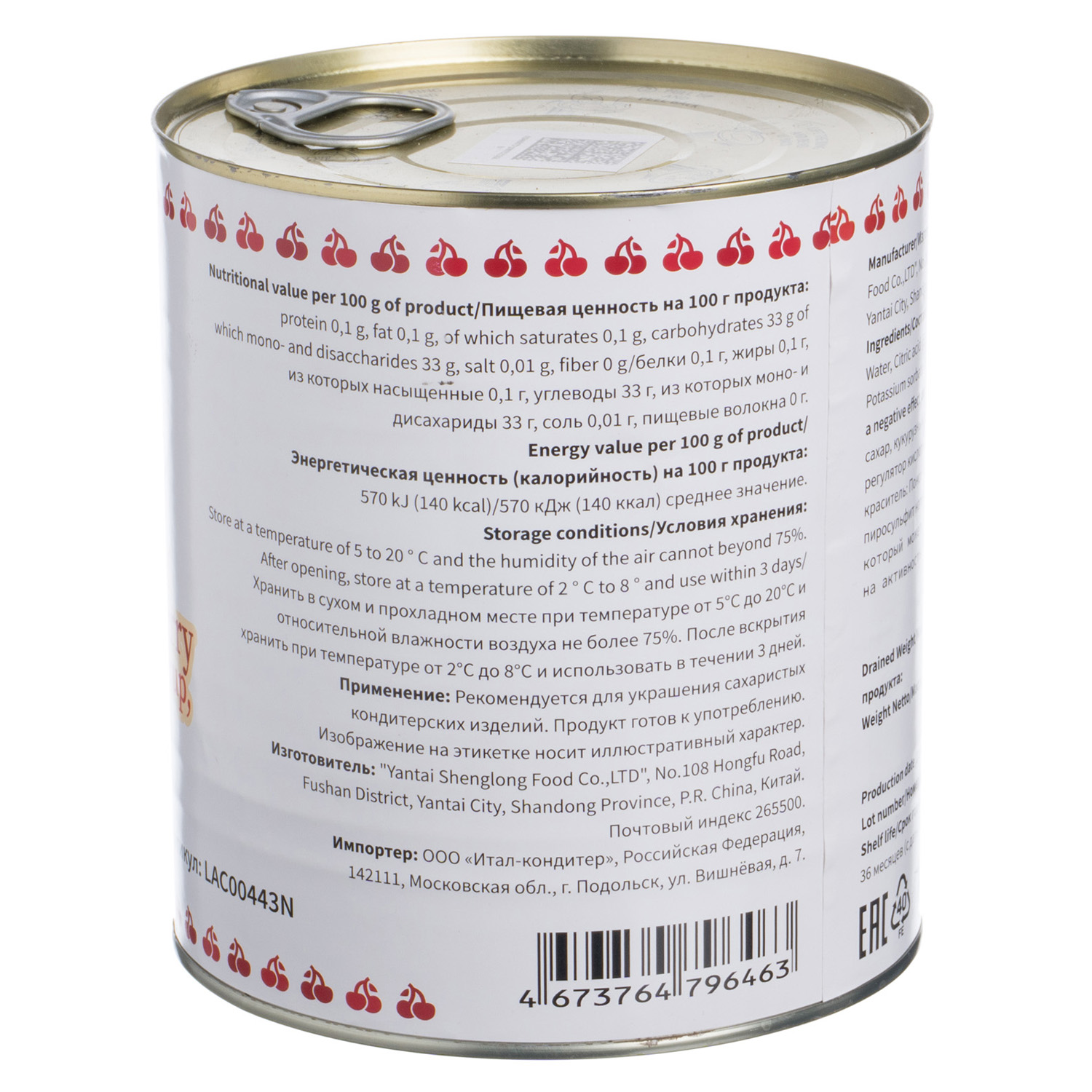 Черешня коктейльная 3,3 кг. в сиропе, красная с веточкой, паст. /1/