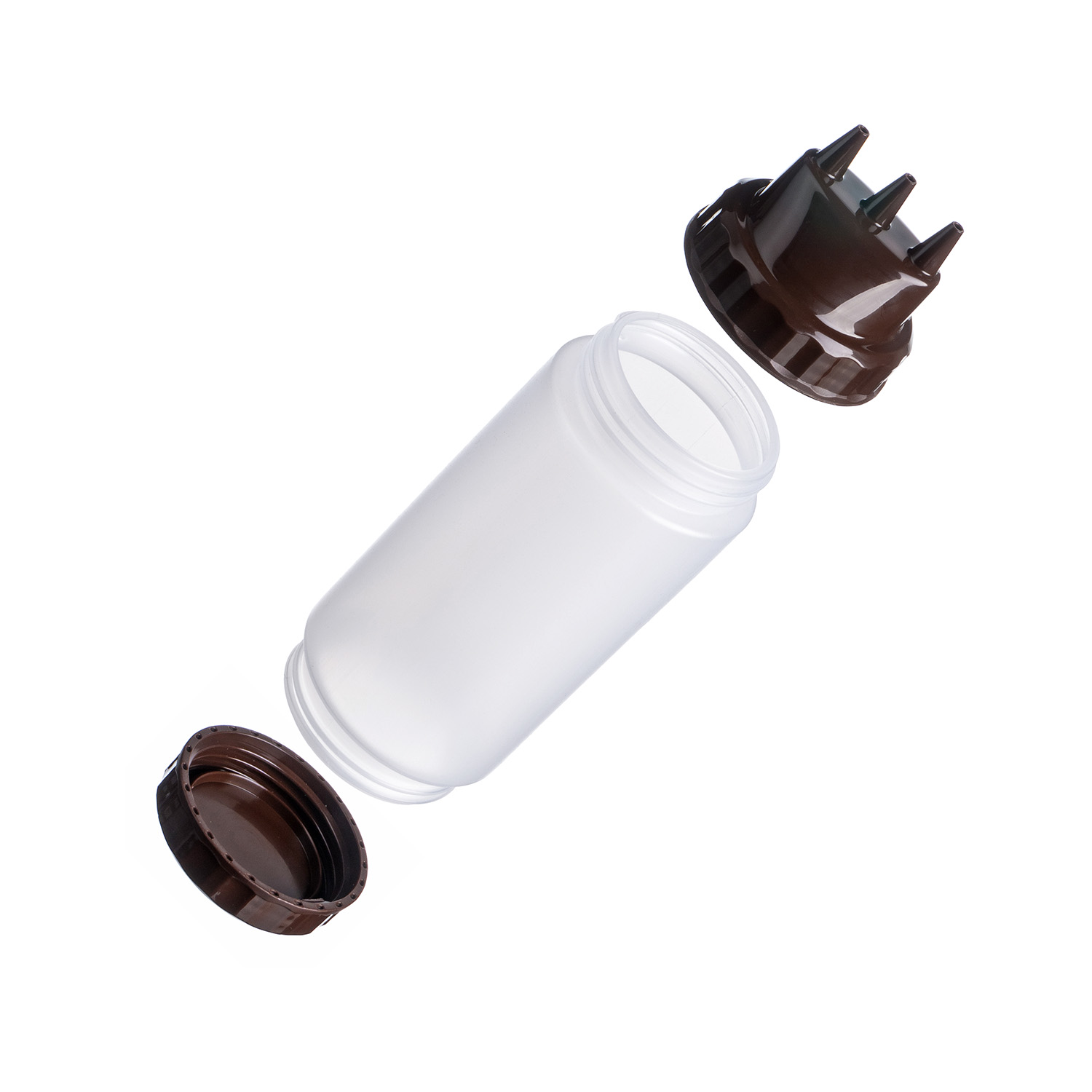 Емкость для соуса 500 мл. d=70 мм. h=200 мм. с 2 крышками 3 носика, широкая прозрачная, крышки коричневые GP /1/96/