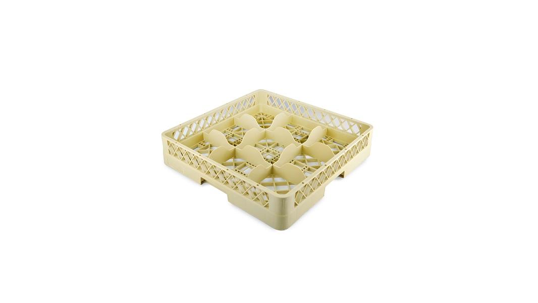 Кассета для фужеров 9 секций, бежевая (полипропилен) используется для мытья одноразмерной посуды (фужеров, бокалов и др.), кухонного инвентаря, столовых приборов на профессиональной кухне предприятий общественного питания. Кассеты имеют стандартные размеры, что позволяет использовать их во всех существующих профессиональных посудомоечных машинах: фронтального, купольного и туннельного типа. Максимальный диаметр посуды для размещения в ячейках кассеты 150 мм. Помимо мойки, кассеты используются для хранения и транспортировки посуды из моечной зоны в зону раздачи, что позволяет избежать её загрязнения и значительно уменьшить бой посуды.