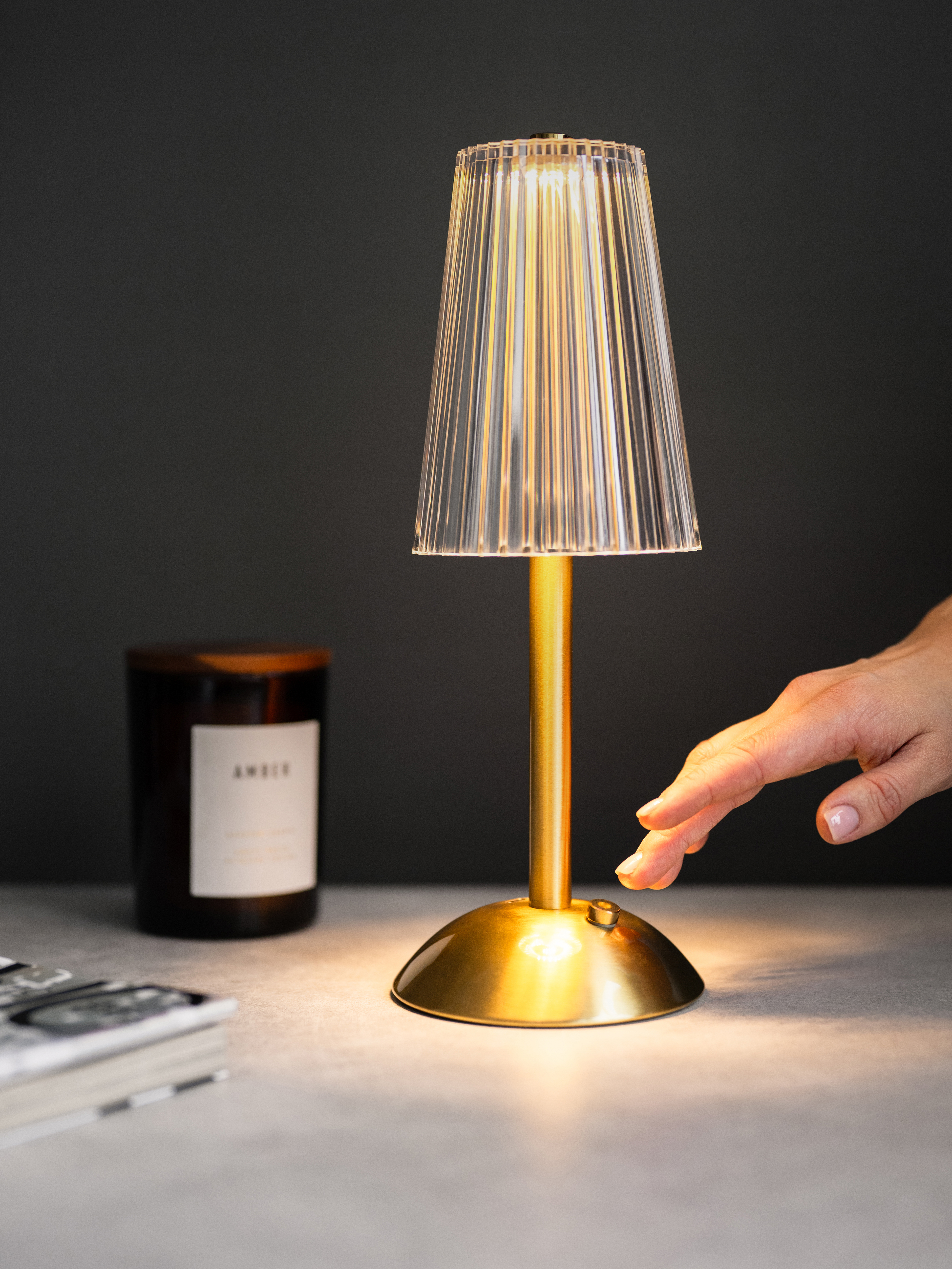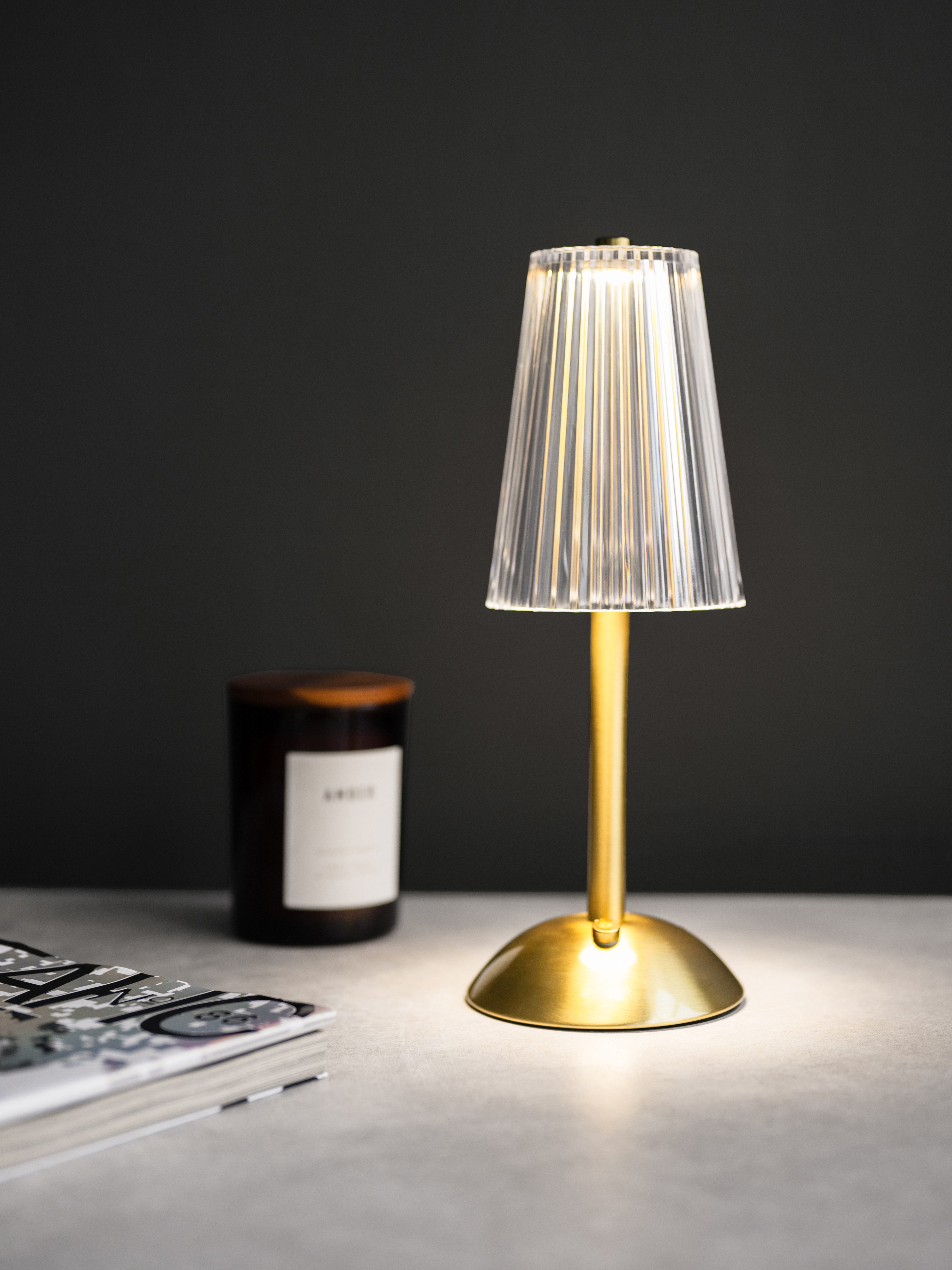 Лампа настольная беспроводная d=11 см. h=29,5 см. 3 цвета (телпый/натуральный/белый), 1 режим яркости, нерж./акрил, золотая LED CRYSTAL MGline /1/20/