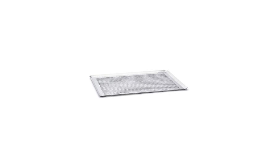 Микроперфорированный прямоугольный противень со скошенными краями, изготовленный из алюминия без покрытия.
