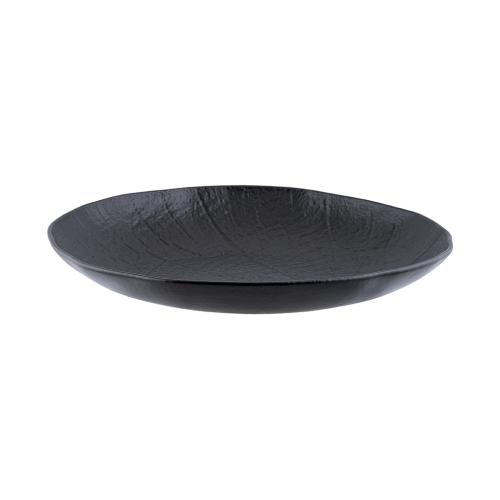 Тарелка насыщенного черного цвета со стилизацией поверхности под рисунок листьев лотоса.