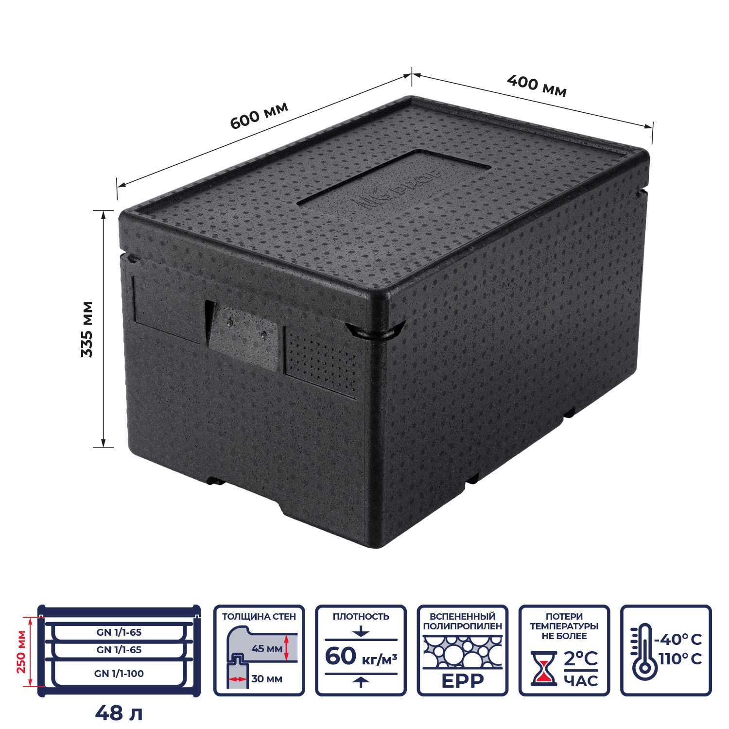 Толщина стенок термоконтейнера составляет 30 мм., толщина крышки - 45 мм.