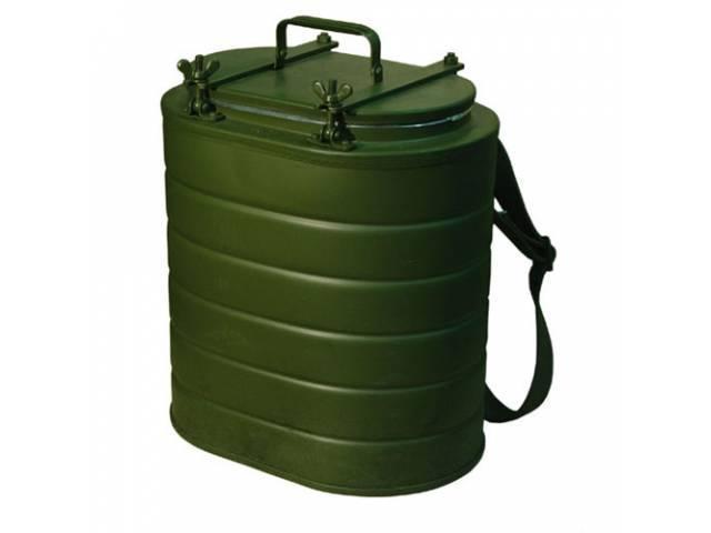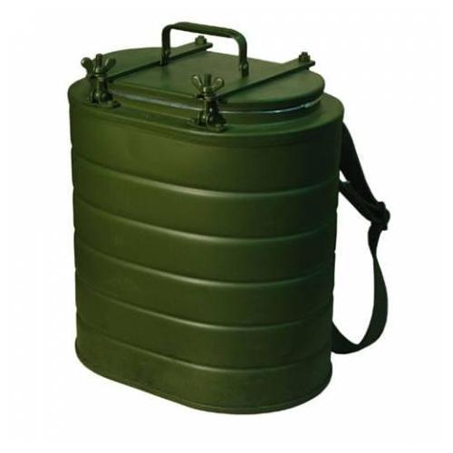 Термос походный состоит из крашеного металлического контейнера корпуса, вынимающейся нержавеющей колбы и крышки притягиваемой болтами с барашками.